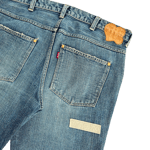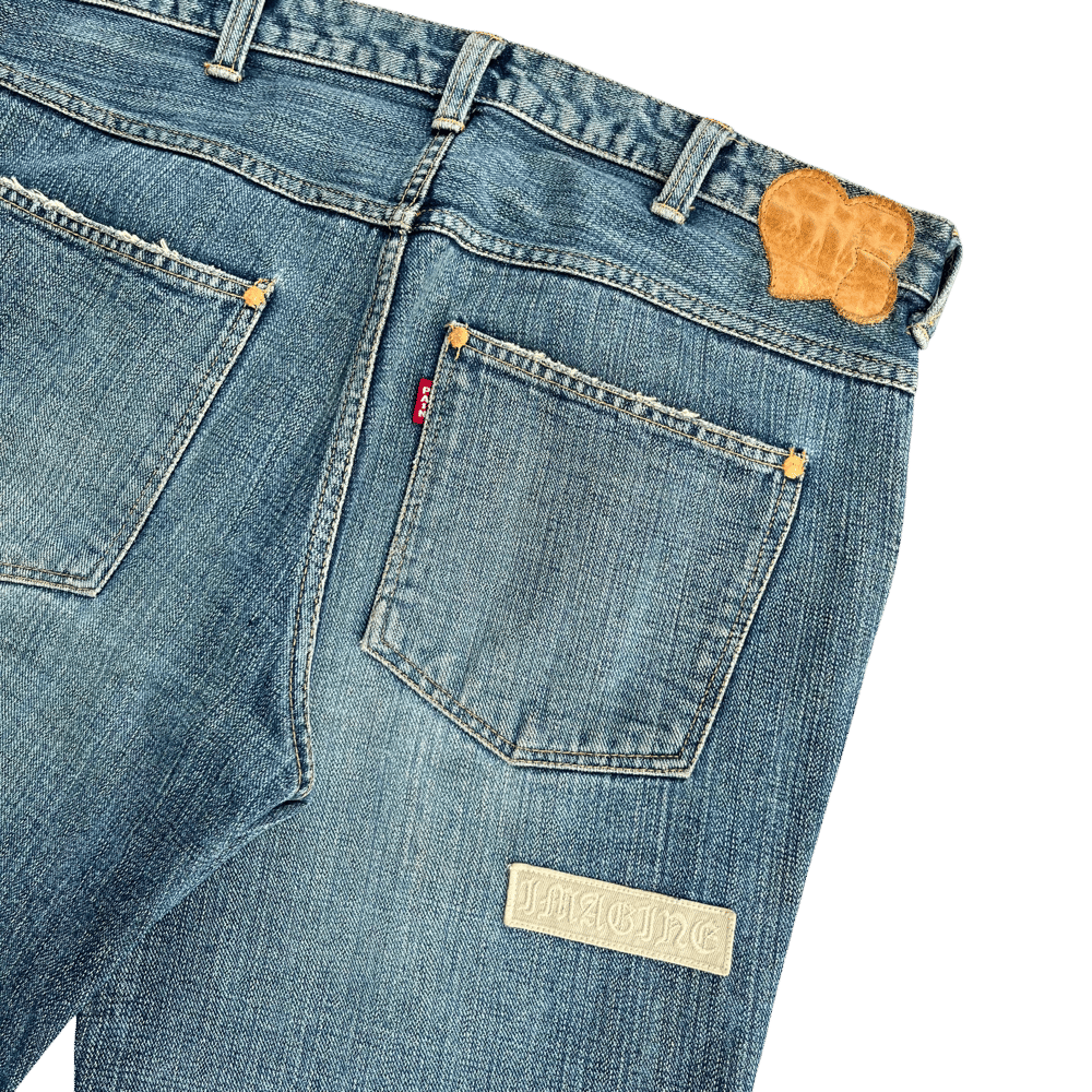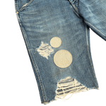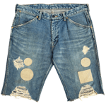 These jean cut-off shorts, from A/W 2004 "Give Peace a Chance" collection, feature off-white tonal embroidered patches throughout. Additionally, the bottoms have factory distressing and Number (N)ine's signature crying heart waist tag patch in tan leather.