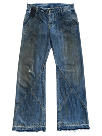 This pair of flare jeans from A/W 2004 are made of a navy blue denim, lightly treated with a "mud" wax coating. Additionally they feature spiral twisted leg seam paneling, light distressing, raw unfinished hems, and SLAB's signature embroidered rectangle at the right hip in black.