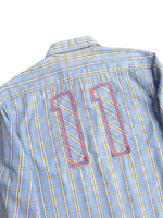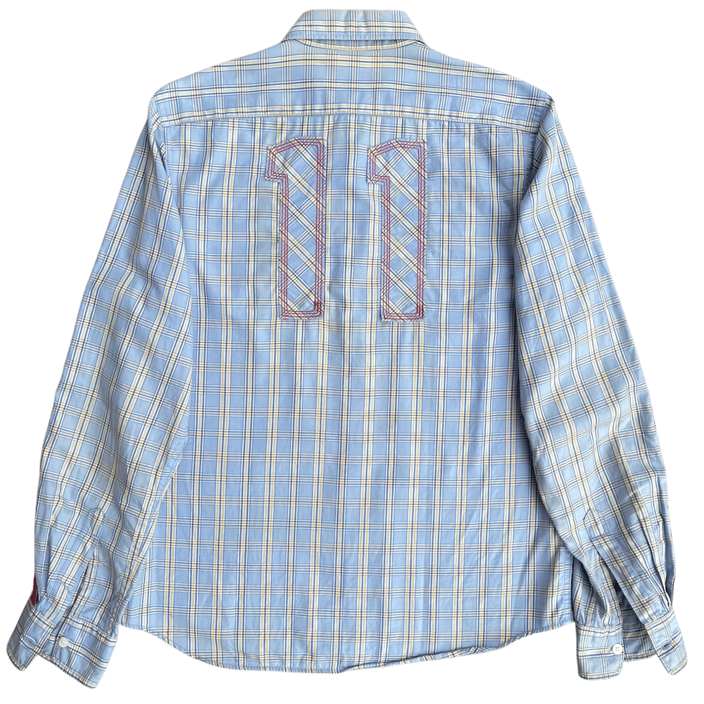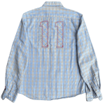 This light blue plaid cotton button-up features red & blue stripe detailing along the sleeves as well as #11 patched on the back in matching plaid fabric.
