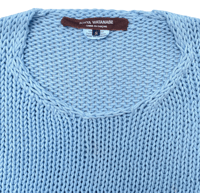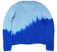 This loose cable knit, scoop neck cotton top features a baby blue base with a royal blue dip dyed bottom portion. The angled dye pattern created the beautiful streaks of color as the garment was absorbing the dye.