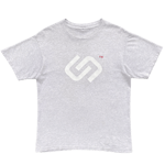 This single stitch, heather grey cotton t-shirt features a front screenprint graphic in white and red.