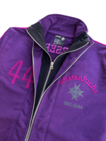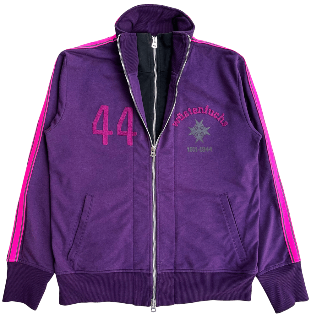 This cotton blend zip-up jacket features a double layered front zipper, giving the illusion of 2 garments. Additionally, it has chain stitch embroideries and screenprint graphics on the front & back.