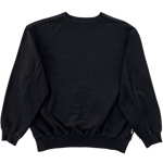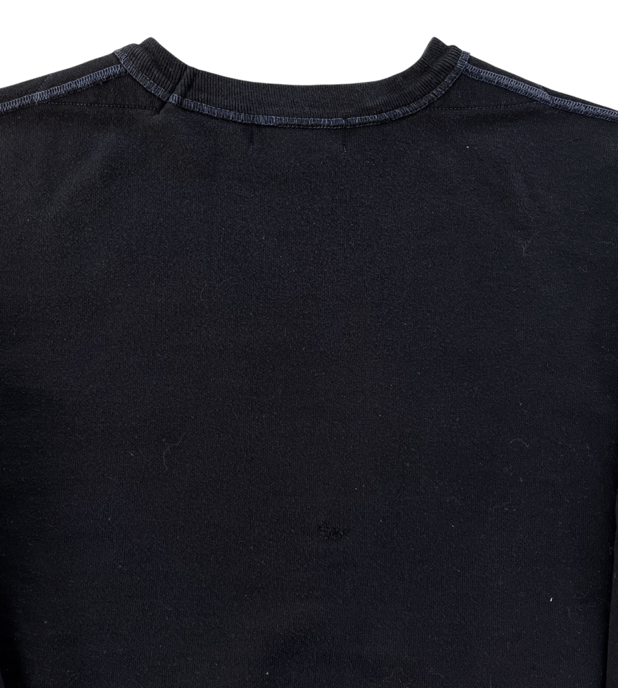 This dyed black French terry cotton sweatshirt features a front screenprint graphic in black and a hidden side zipper pocket on the left. Additionally, the original navy stitching is still visible throughout, creating a unique detail.