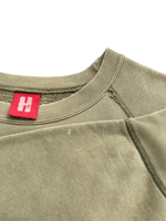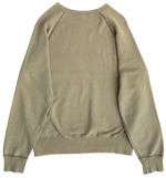 The olive brown, French terry cotton crewneck sweatshirt features a front screenprint in white depicting a topless women with a devil wearing a "playboy bunny" necklace.