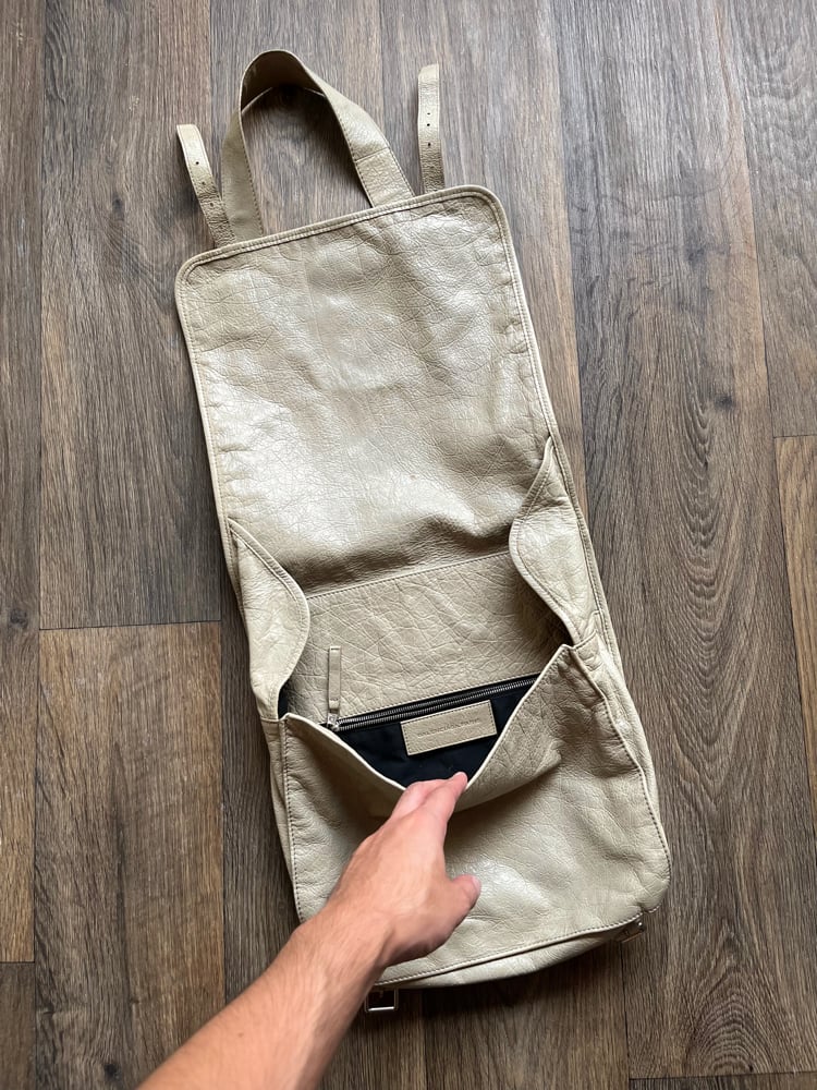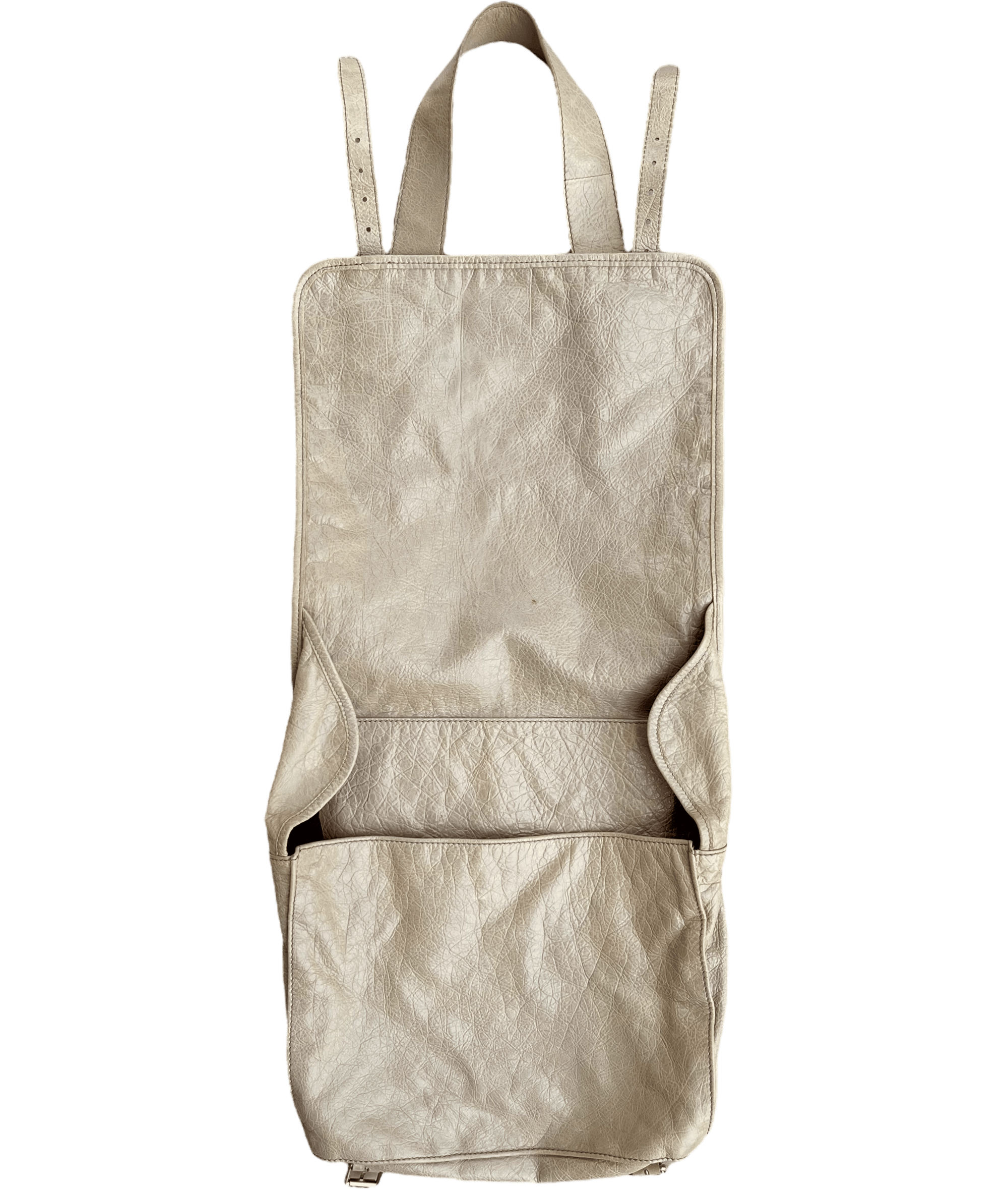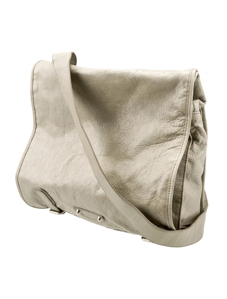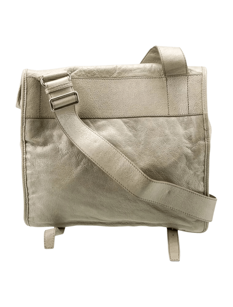 Taupe colored leather with silver-tone hardware, adjustable shoulder strap, and
