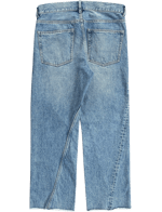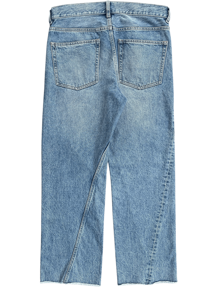 These 5 pocket jeans feature intentionally twisted seams down the slim cut legs. Additionally, they have raw cut hems.