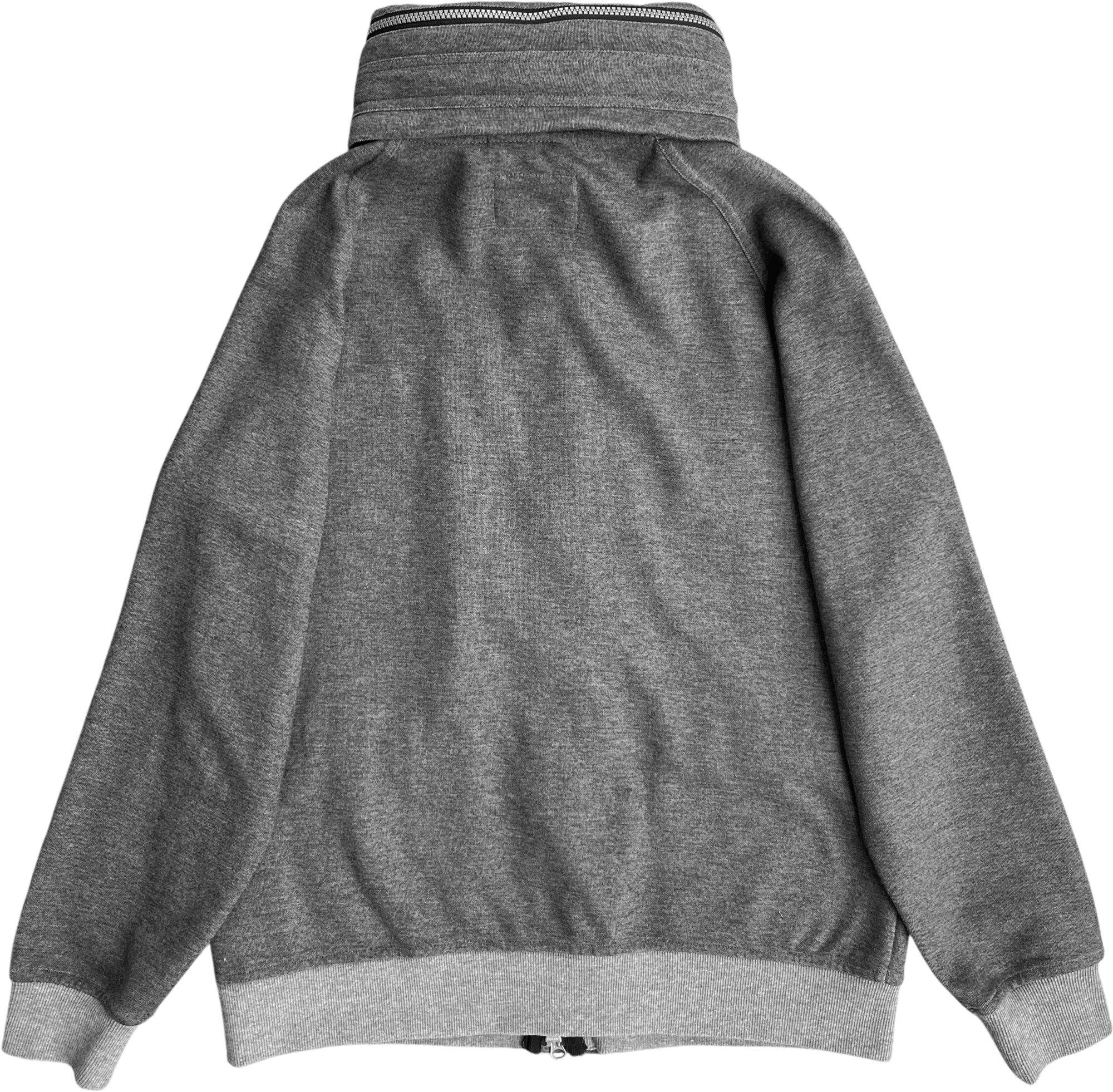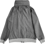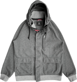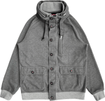 This heather grey bomber style jacket is made of a soft cotton/poly blend. It features 5 pockets, a packable hood, and stripe detailing along the buttons.