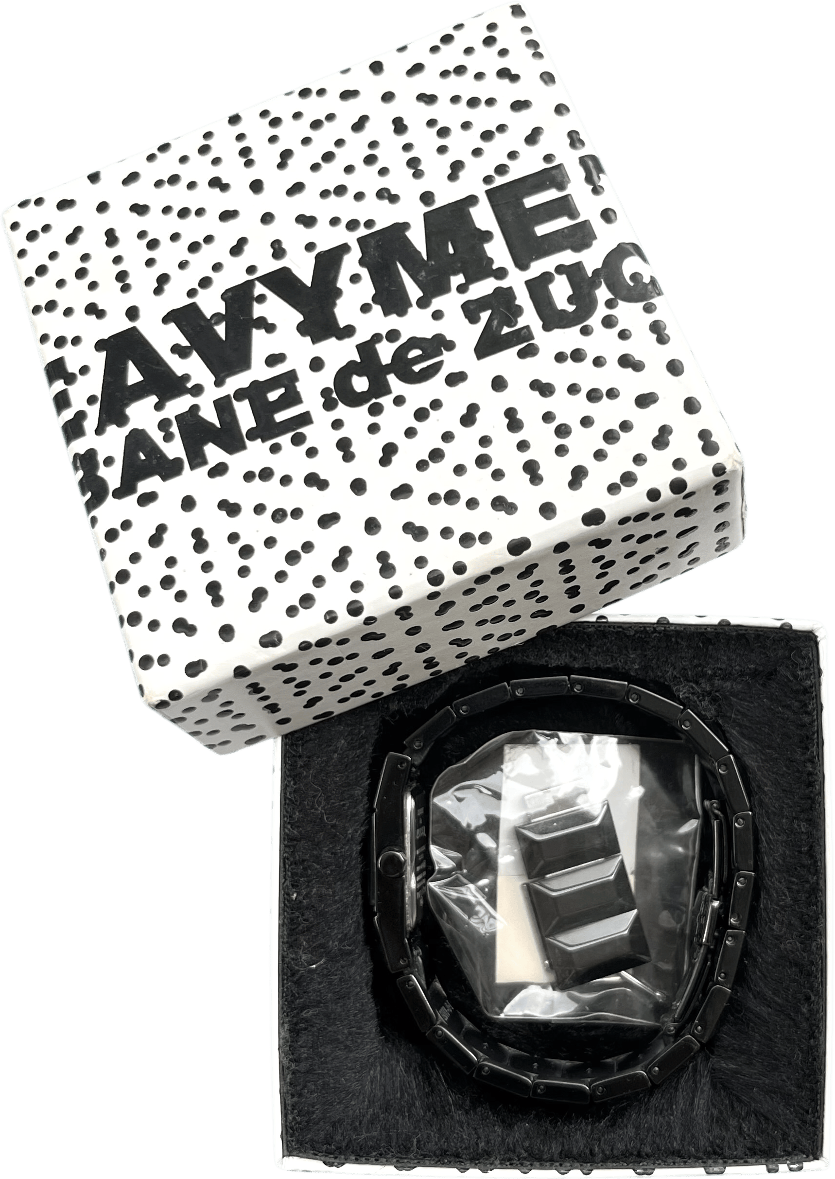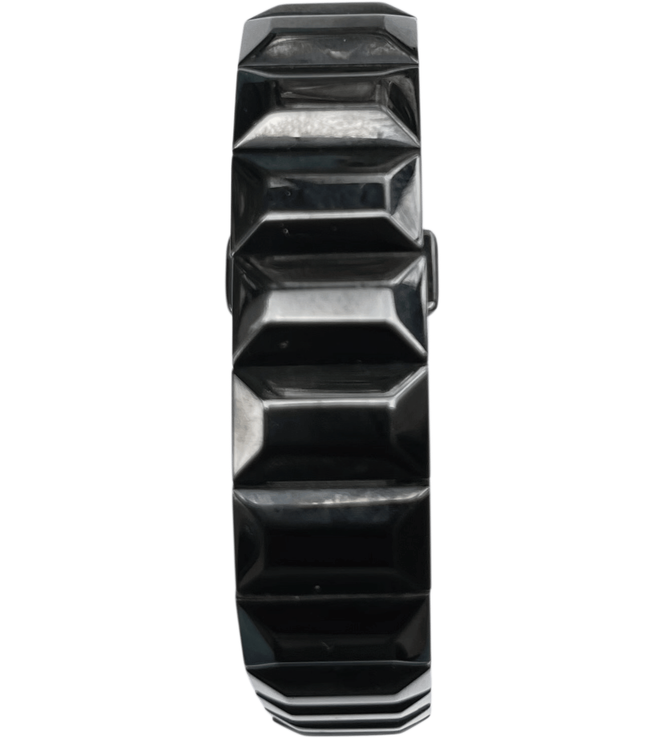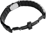 This slim watch is made of water resistant stainless steel with a polished black finish. Includes original box and 3 extra links to expand the wristband. Needs battery replacement.
