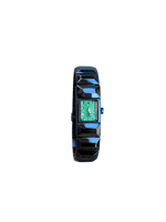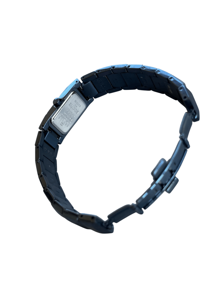 This slim watch is made of water resistant stainless steel with a metallic deep blue finish. Includes original box and 4 extra links to expand the wristband. Working w/ battery.