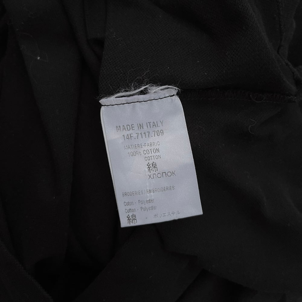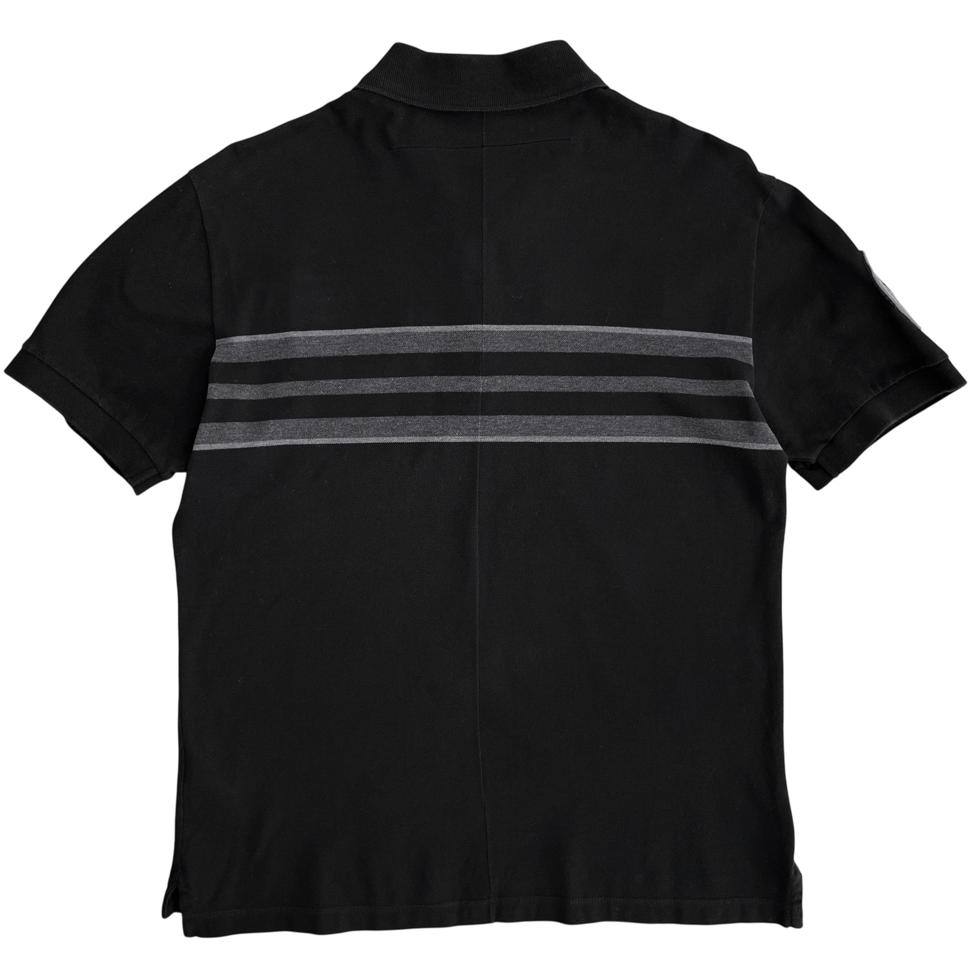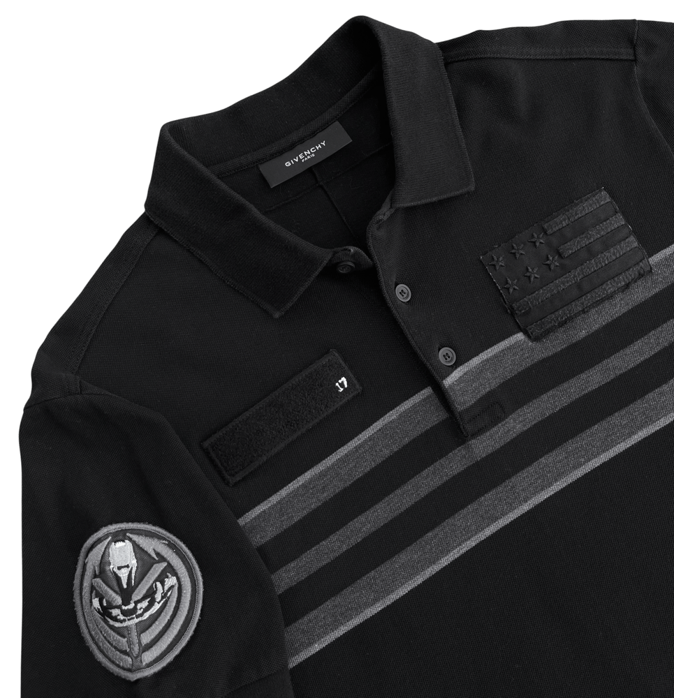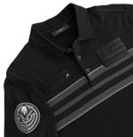 This black knit cotton polo features gray stripes along the chest and 3 unique monochromatic patches, including an black American flag.