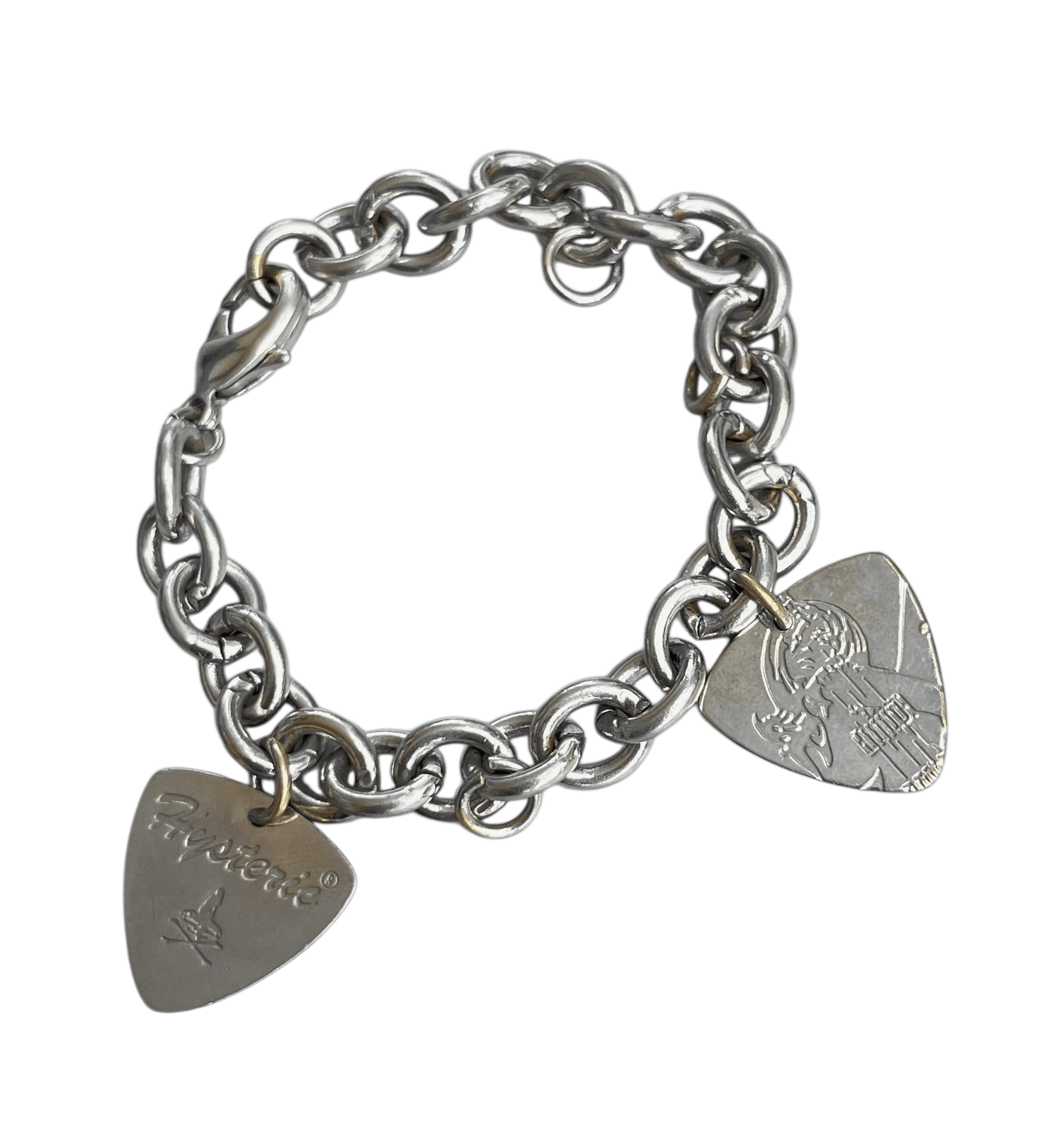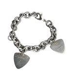 This silver tone, stainless steel cable chain bracelet features 2 guitar pick shaped with unique engraving on each side.