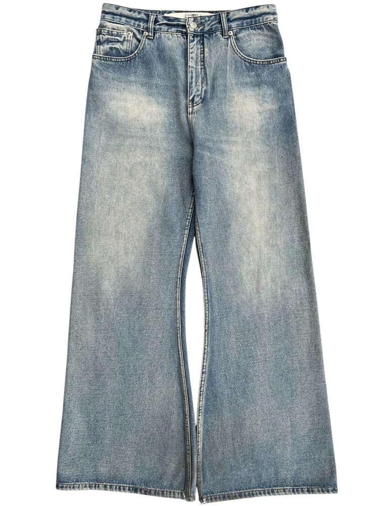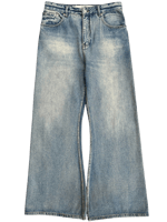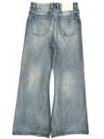 These soft cotton, light wash denim feature an exaggerated baggy flare leg cut. Additionally, they have 5 pockets and a zipper fly.