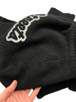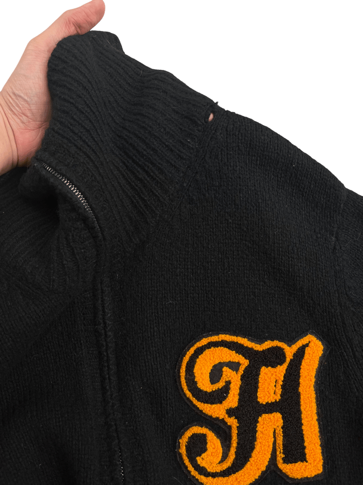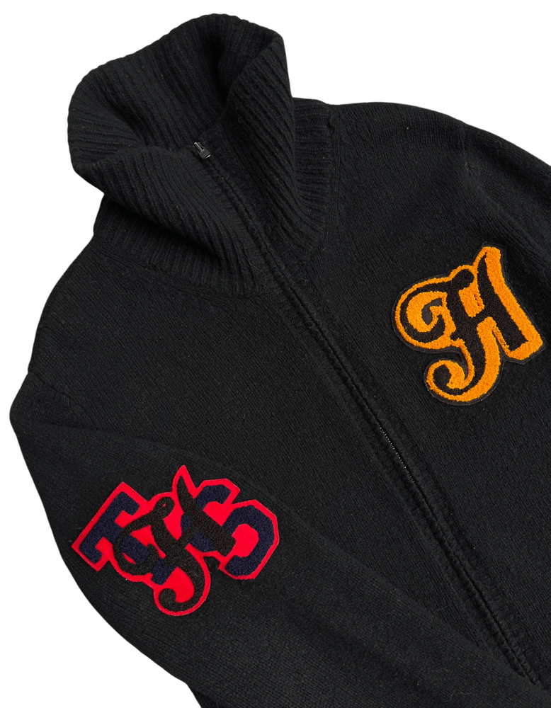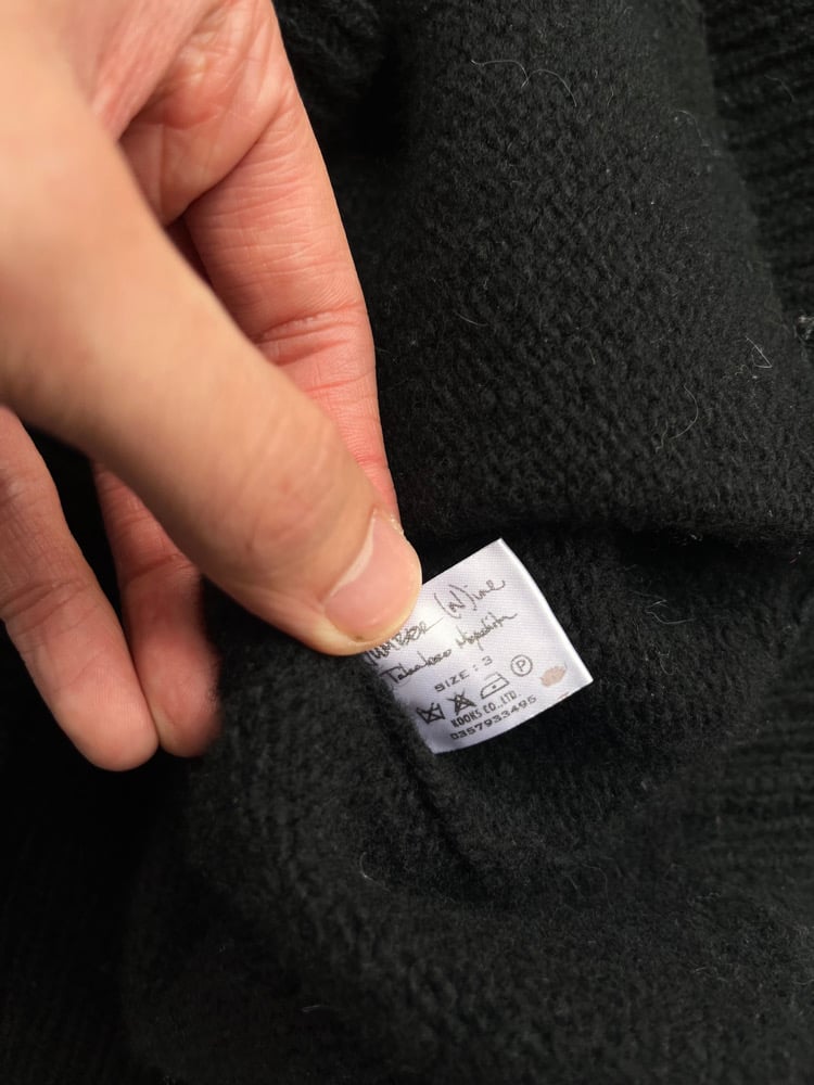 This soft, black wool sweater is from A/W 2005 "The High Streets," arguably Number (N)ine's most famous collection. It features 3 chenille embroidered patches, 2 front pockets and a center riri zipper which runs up the high neck, ribbed collar.