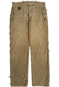 These olive green/brown cotton pants feature double layer quilting throughout, with the rear panels and waistband having a heavily distressed top layer. The distressing results in look similar to "ghillie suits" used for camouflage in the military. Additionally, the pants have 4 pockets, metal D-ring, and a hammer loop.