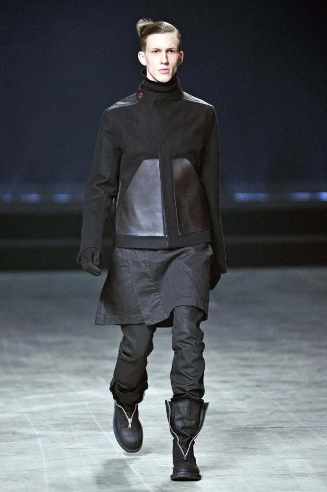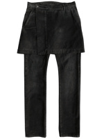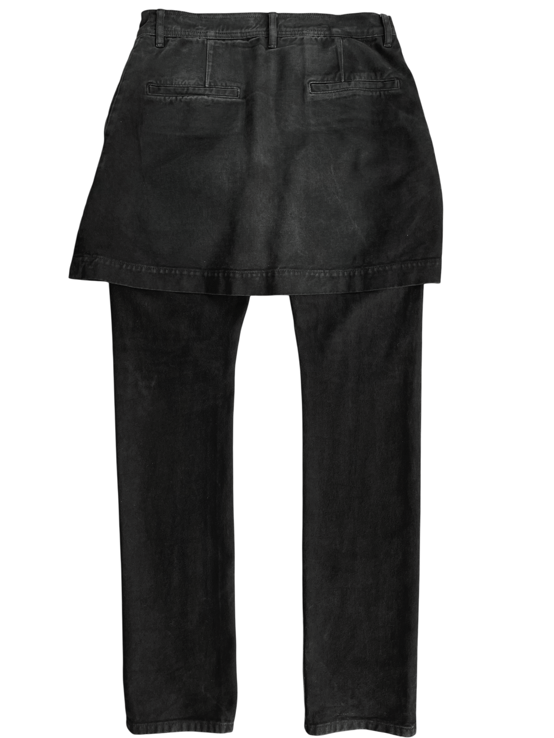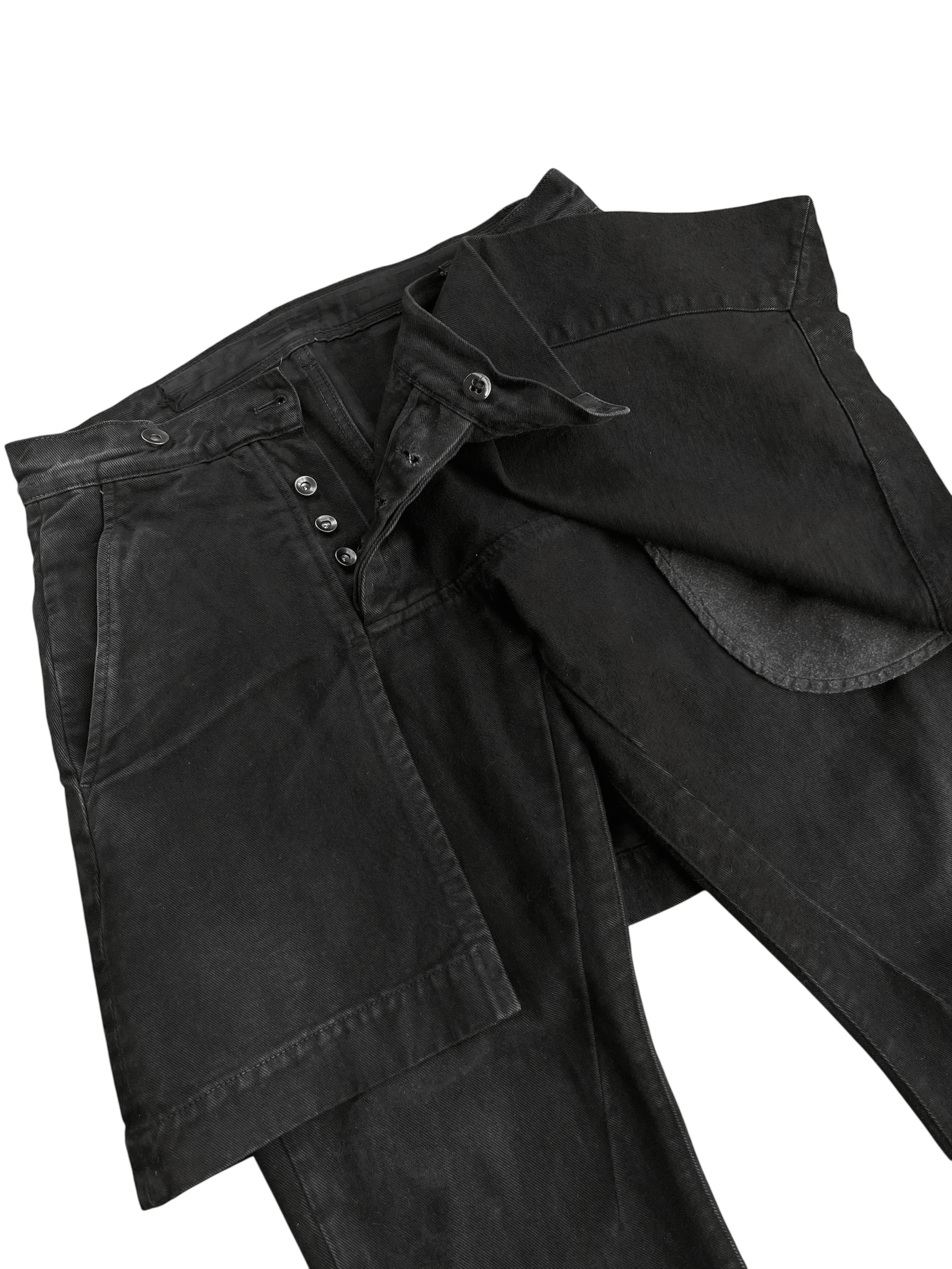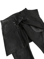 These "Detroit" cut denim are made of a soft, black cotton denim. Additionally, attached at along the waistband is a kilt containing 4 pockets. Based on the F/W 2011 "LIMO" kilted jeans