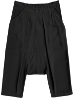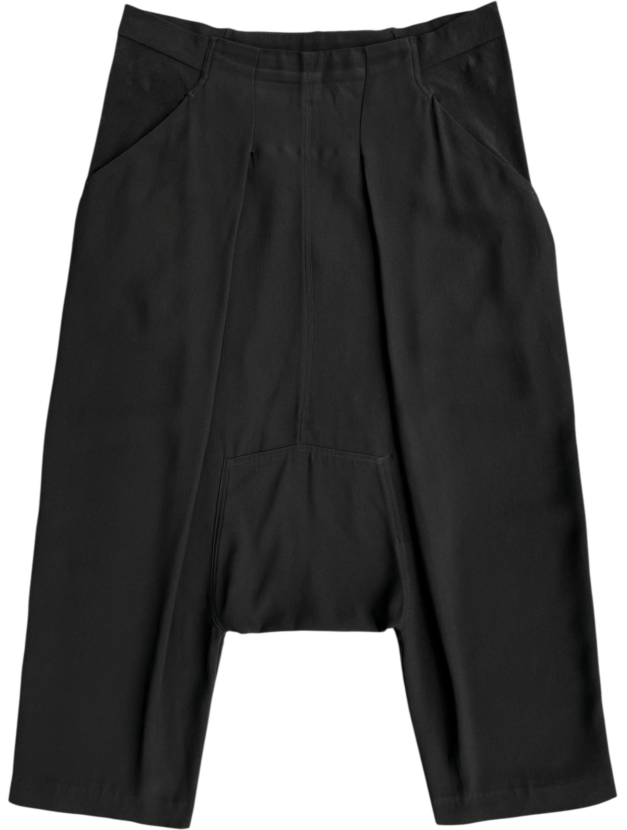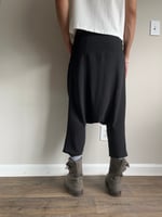 These Acetate/Viscose plant-based blend cropped pants are from F/W 2017 "GLITTER" collection. The bottoms feature 2 front pockets, intricate paneling, as well as Rick Owen's signature drop crotch.