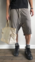 These Cotton/Poly blend shorts are from S/S 2010 "RELEASE" collection. The "Dark Shad" colored bottoms feature 4 pockets as well as Rick Owen's signature elongated drawstrings and drop crotch.