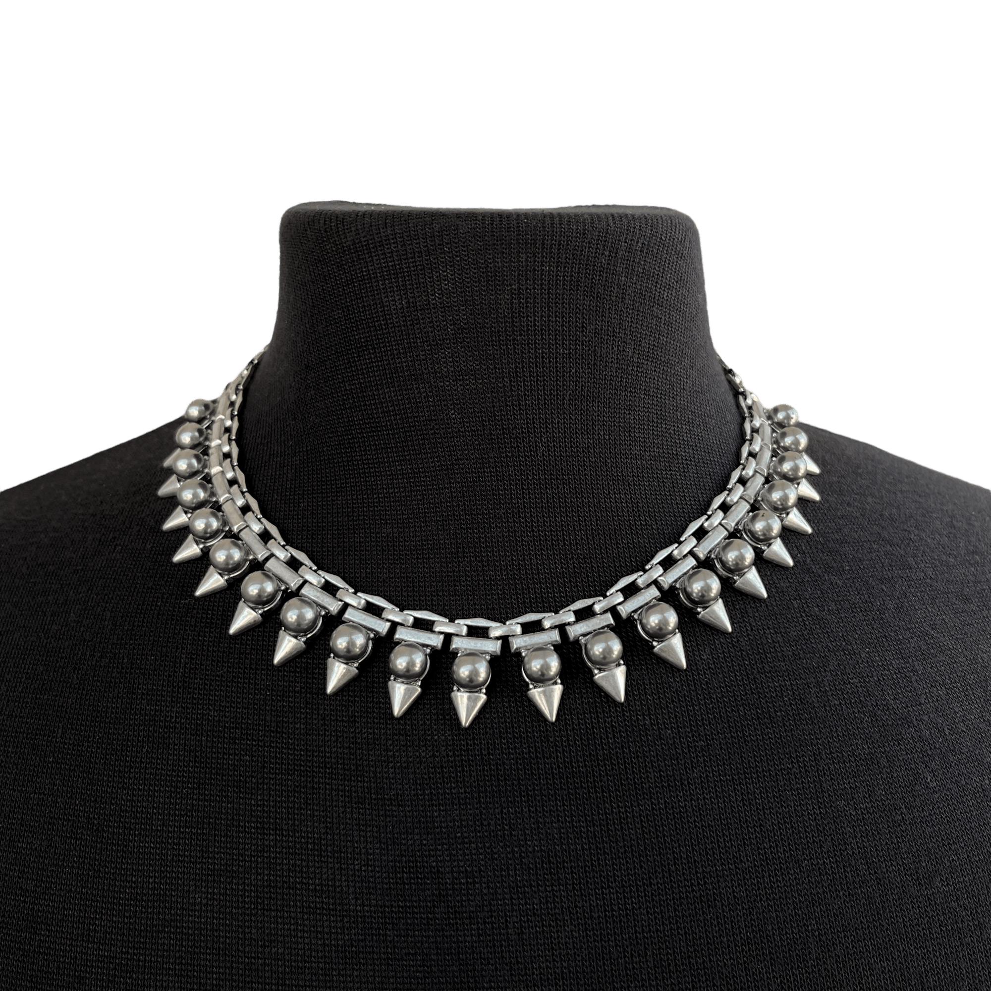 Machine aged silver-tone metal, faux gray pearls, & 2 clasps (could be used as wallet chain)