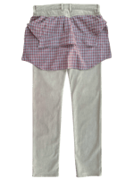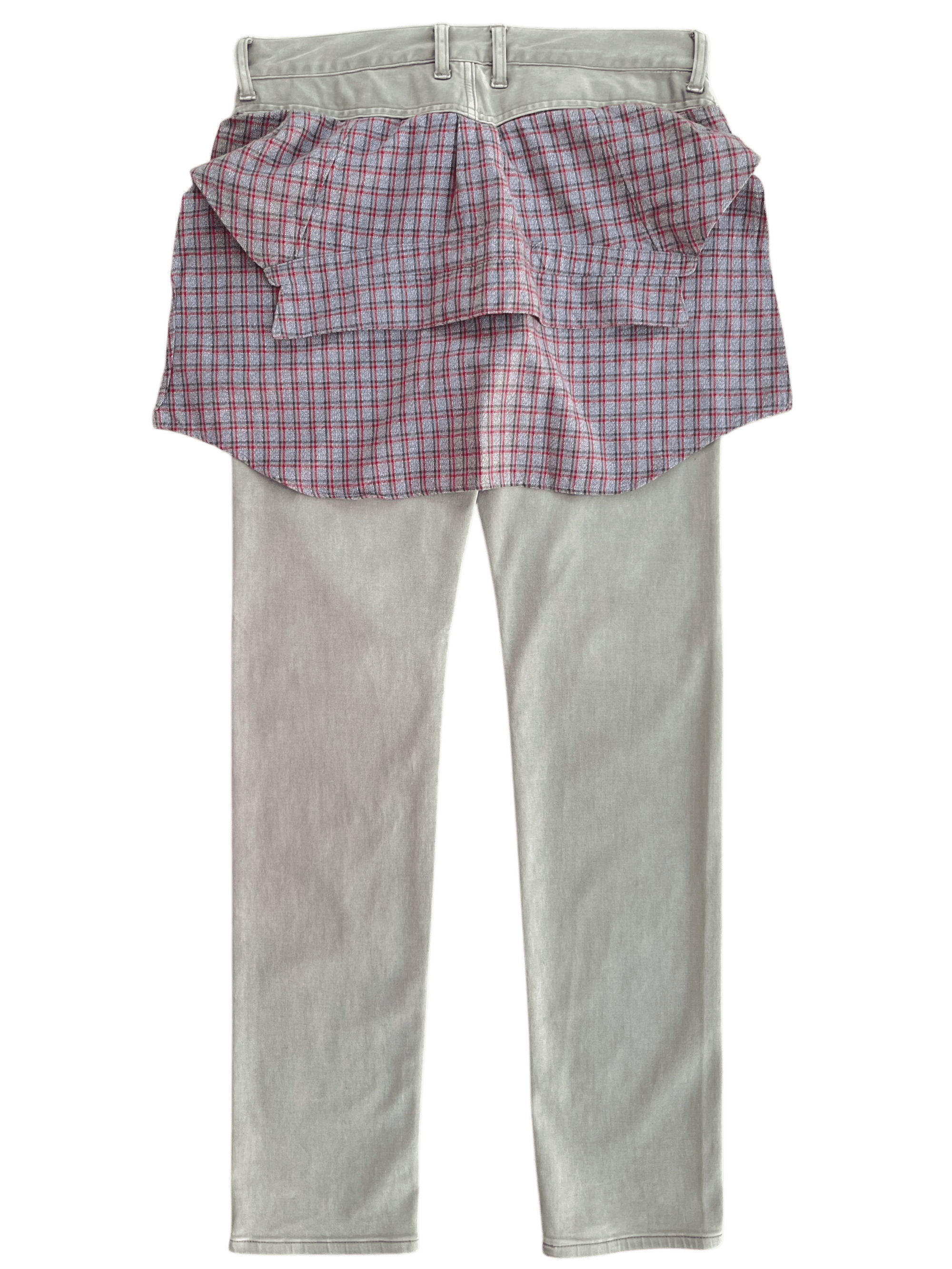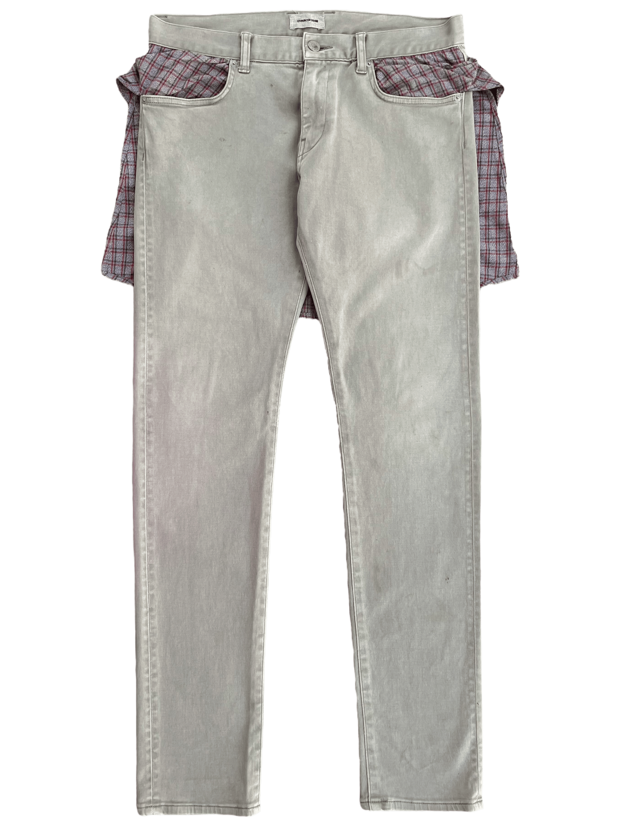 These 5 pocket, skinny cut jeans are made of a light grey stretch denim. Additionally, they feature an attached faux flannel shirt, giving the illusion of having it tried around the waistband. From S/S 2012 "Open Strings" collection
