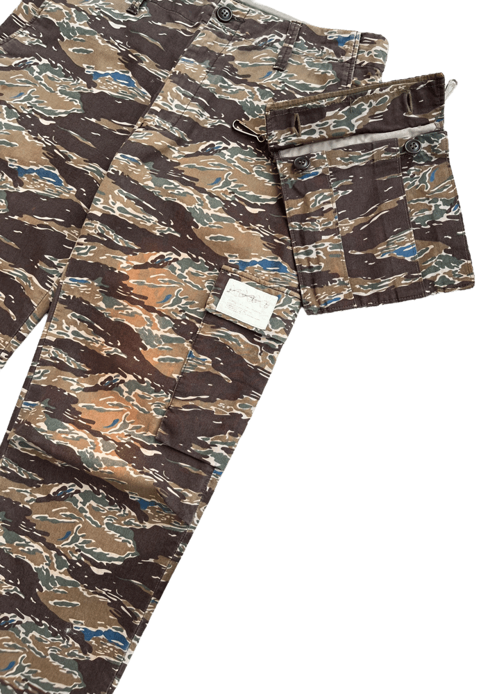 These 6 pocket cargo pants fromS/S 2011 "Underman" collection are made of a unique tiger camouflage cotton with the pattern featuring hits of blue throughout. Additionally, this pair come with the matching cargo pocket bag that can be attached at the belt loops (Sold separately on release). Model is 5'8