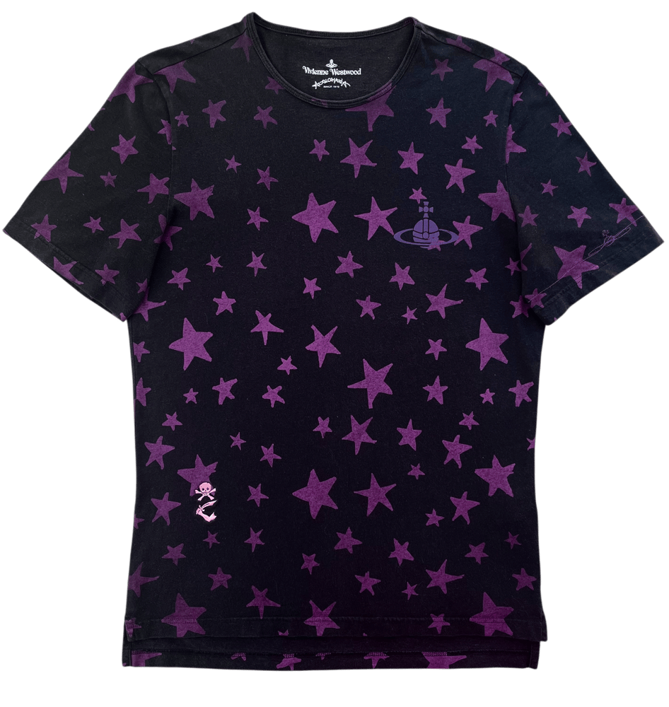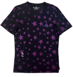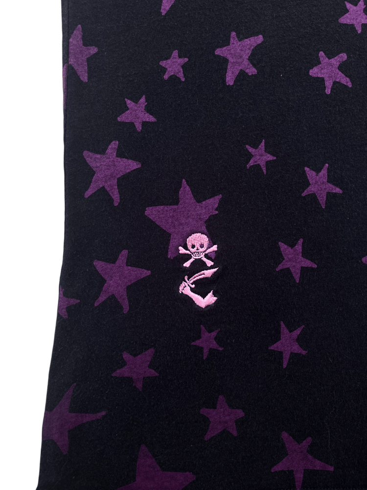 This 100% cotton tee features all-over star screenprints in purple. Additionally, it has an embroidered orb logo around the left sleeve and more logos at the right side of a skull and sword.