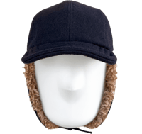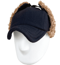 This hunter style hat is made of a navy wool blend outer shell with brown faux-fur lining and ear flaps. Additionally, the short brim features an interior metal wire allowing it to be shaped to your preference.